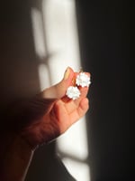 Pendientes de biznagas blancas modeladas a mano, con elegante enganche catalana en tono dorado. Inspirados en la tradición malagueña, combinan delicadeza y encanto artesanal.