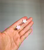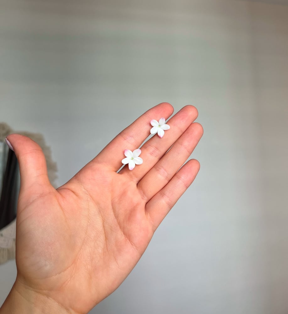 Delicados pendientes hechos a mano con flores de jazmín en pasta de cera, montadas sobre base de acero inoxidable hipoalergénico. Disponibles en dos versiones: con sutiles toques rosados o en blanco, para elegir el estilo que más te represente.